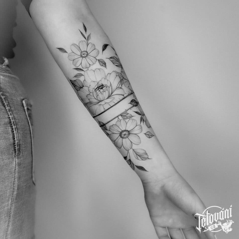 Tetování květiny pivoňka na předloktí
