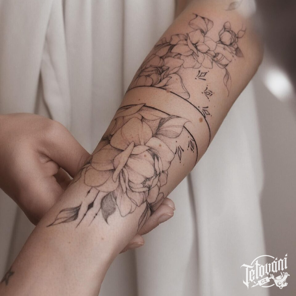 Tetování květiny, pivoňka na předloktí