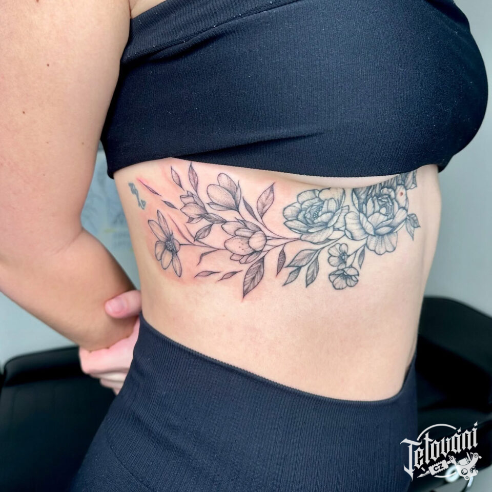Tetování květiny, pivoňka na žebra