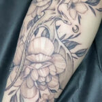 Tetování květiny pivoňky, mýtická bytost drak na lýtko