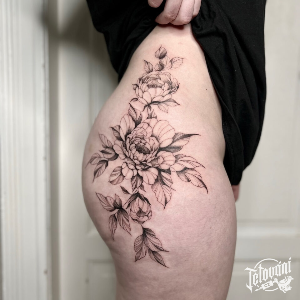 Tetování květiny, pivoňky na boku zadku
