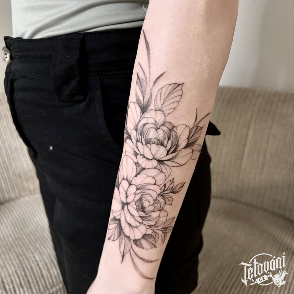 Tetování květiny, pivoňky na předloktí