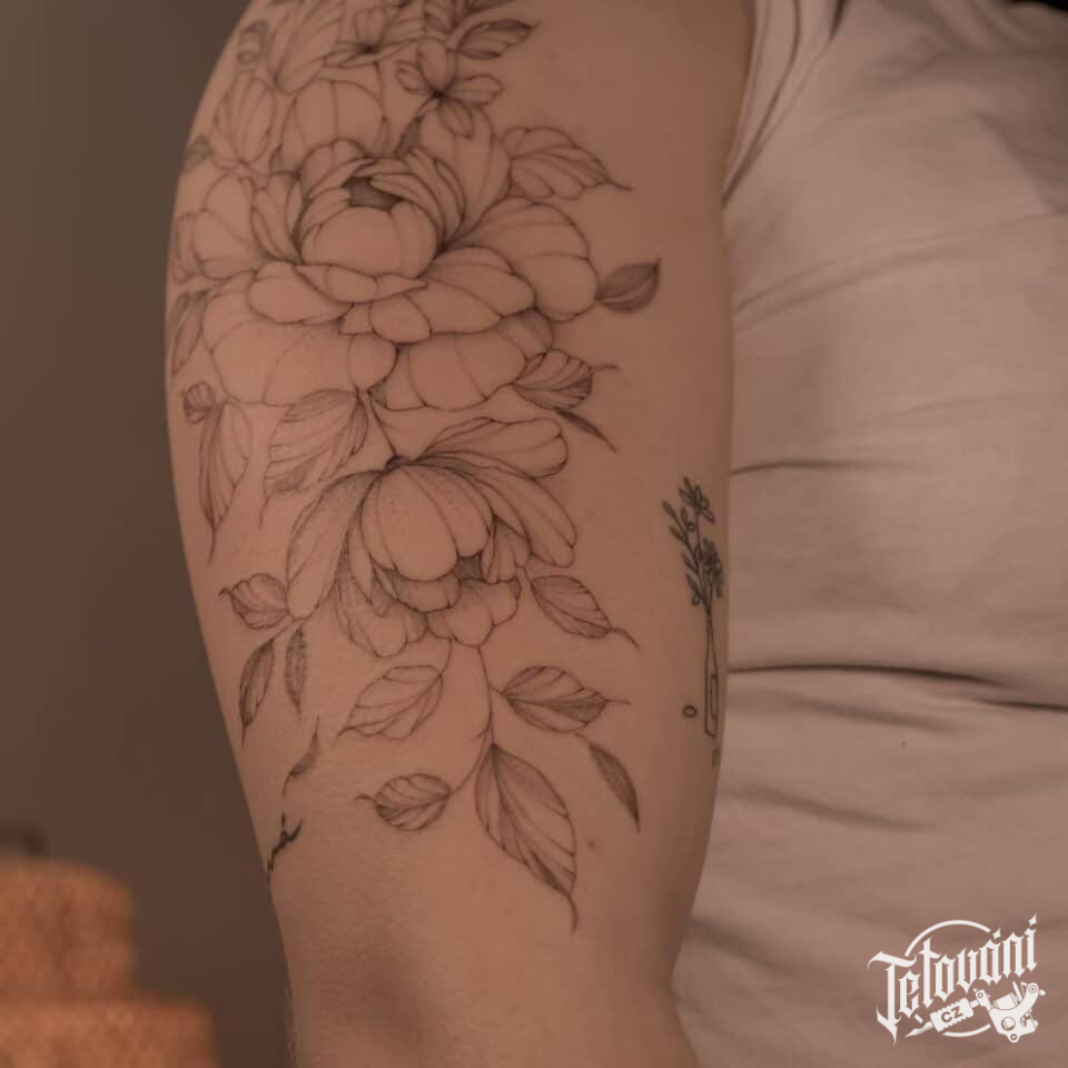 Tetování květiny, pivoňky na rameno