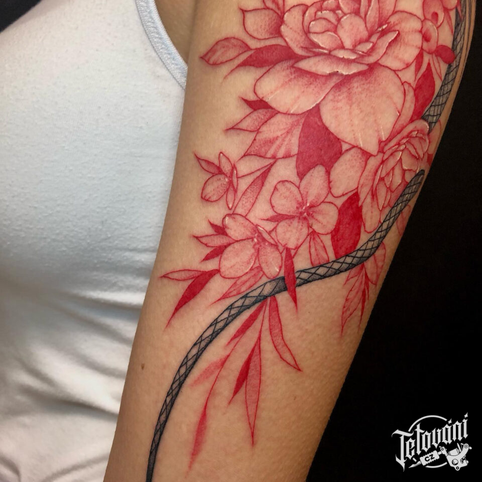 Tetování květiny pivoňky na rameno
