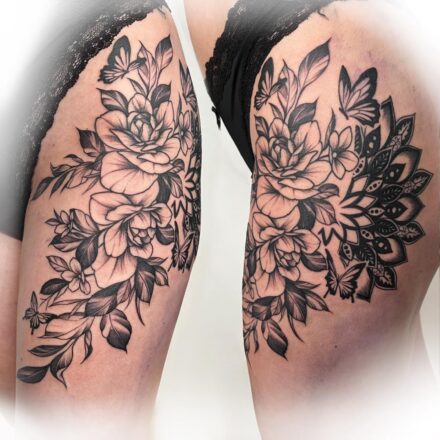 Tetování květiny pivoňky, zvířata motýli na předloktí