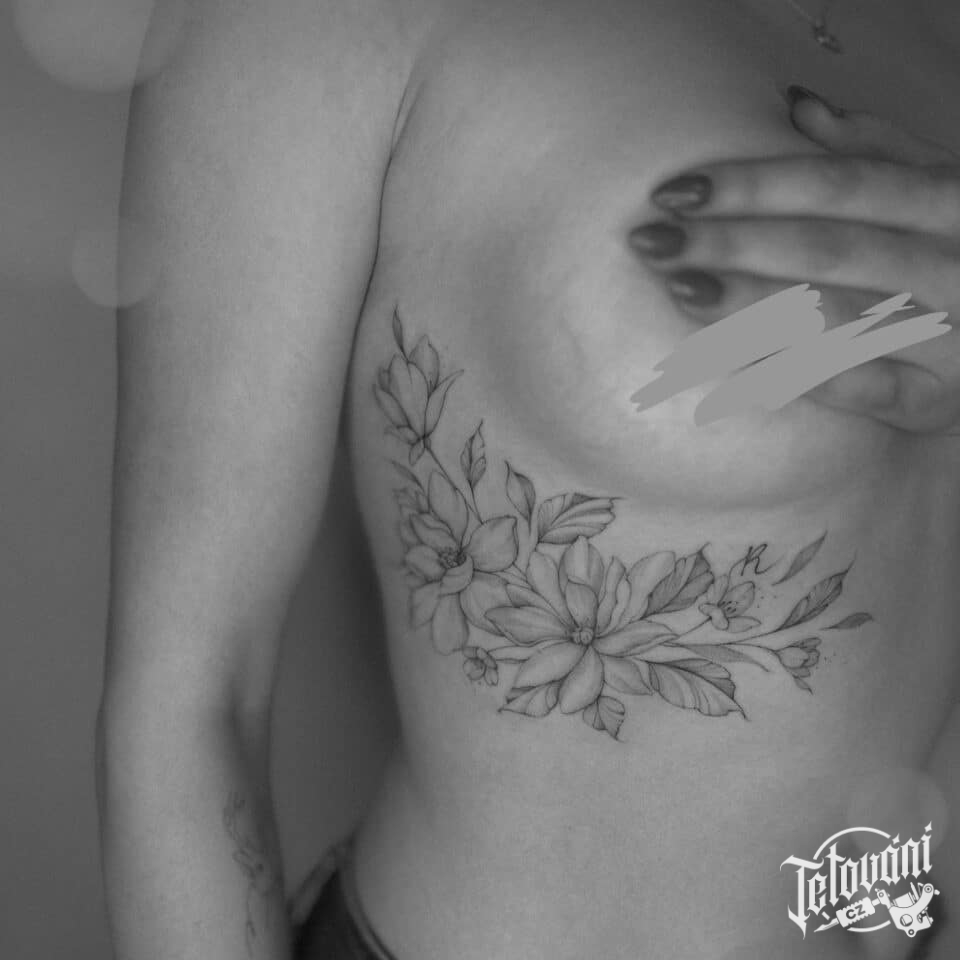 Tetování květiny pod prsa na žebrech