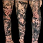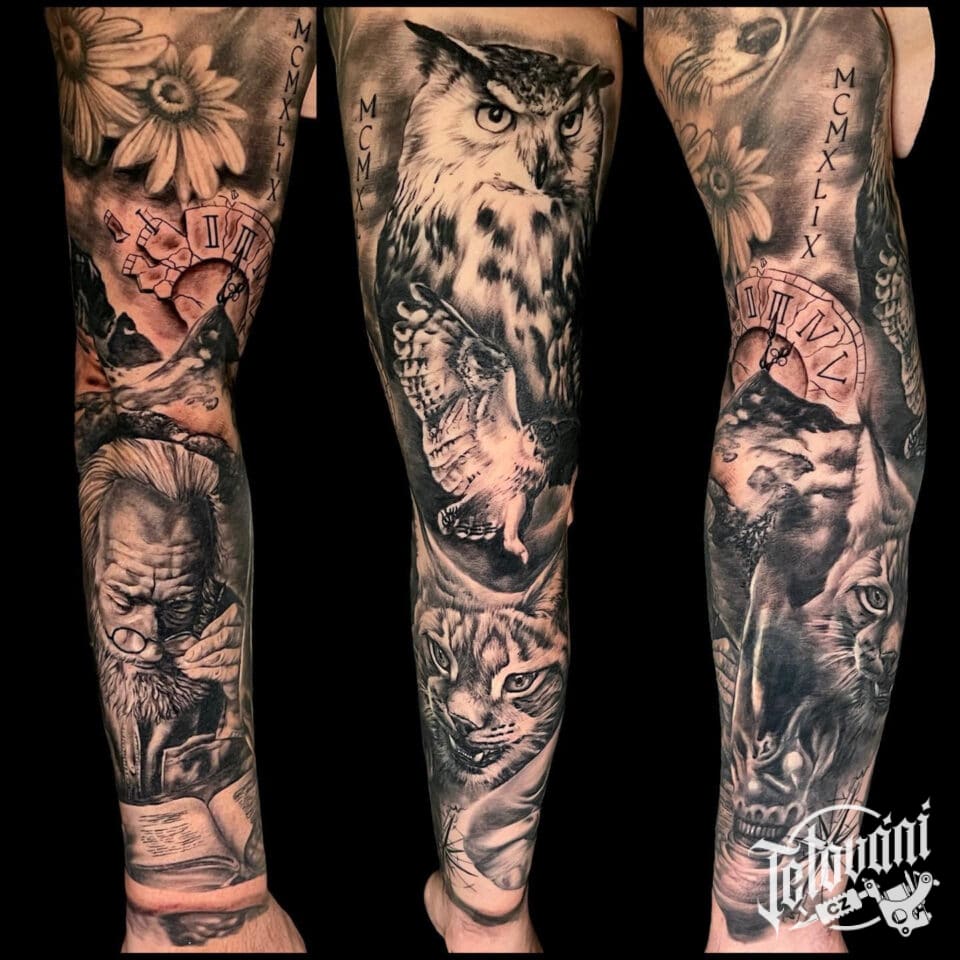Tetování květiny, portréty, zvířata, kočky, sova, ptáci, hodiny, rukáv