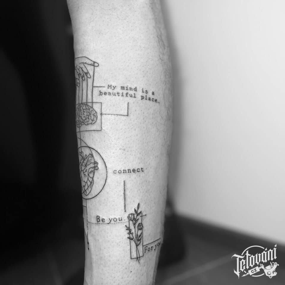 Tetování květiny, ruce, srdce a nápisy na předloktí