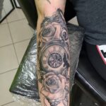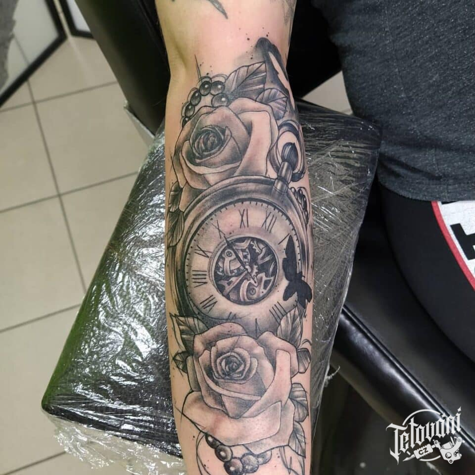 Tetování květiny, růže a hodiny, kapesní hodiny na předloktí
