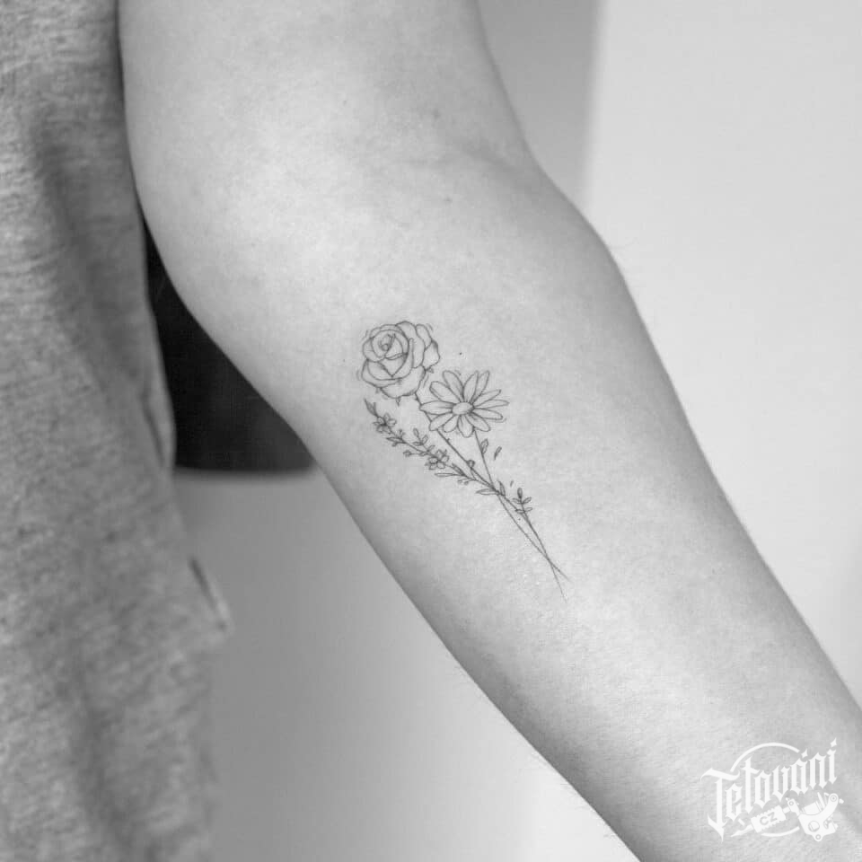 Tetování květiny, růže a kopretina na předloktí