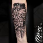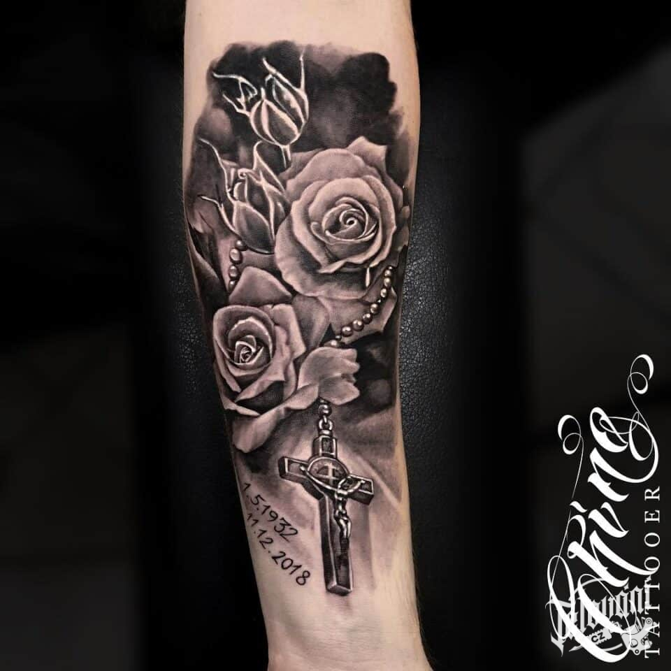 Tetování květiny, růže a kříž na předloktí