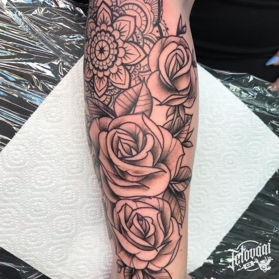 Tetování květiny, růže a mandala na předloktí
