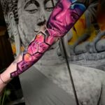 Tetování květiny, růže a portrét ženy, rukáv