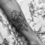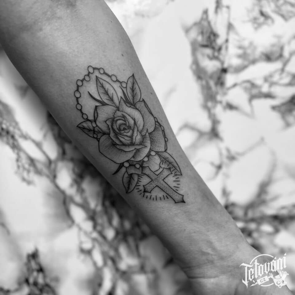 Tetování květiny, růže a růženec na předloktí