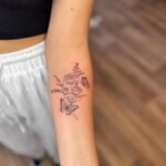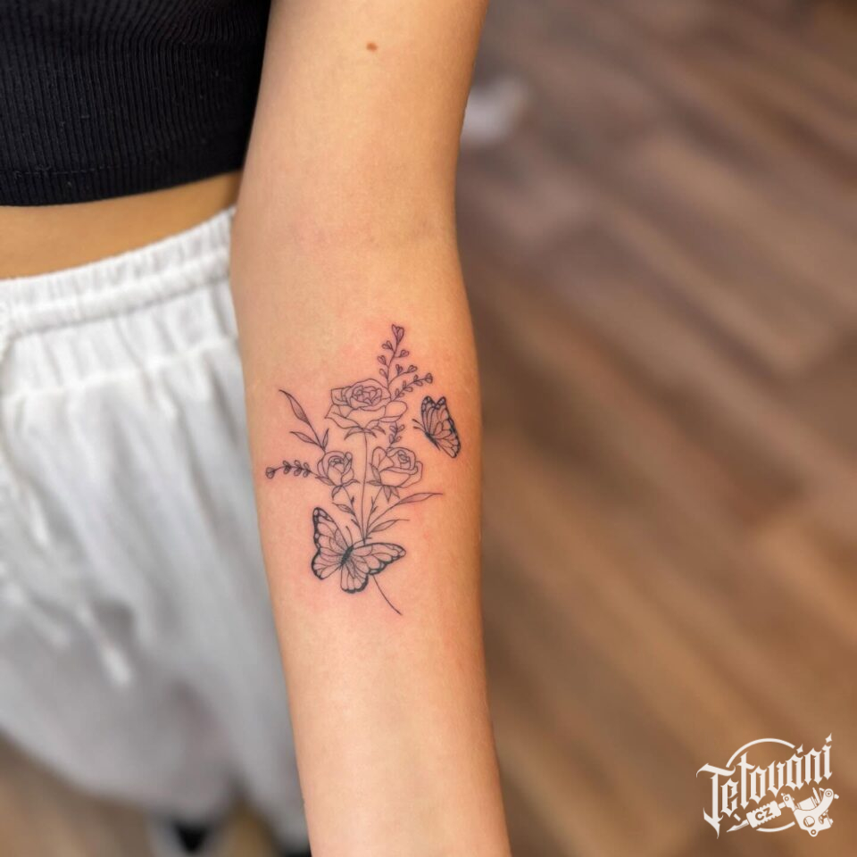 Tetování květiny, růže a zvířata, motýli na předloktí