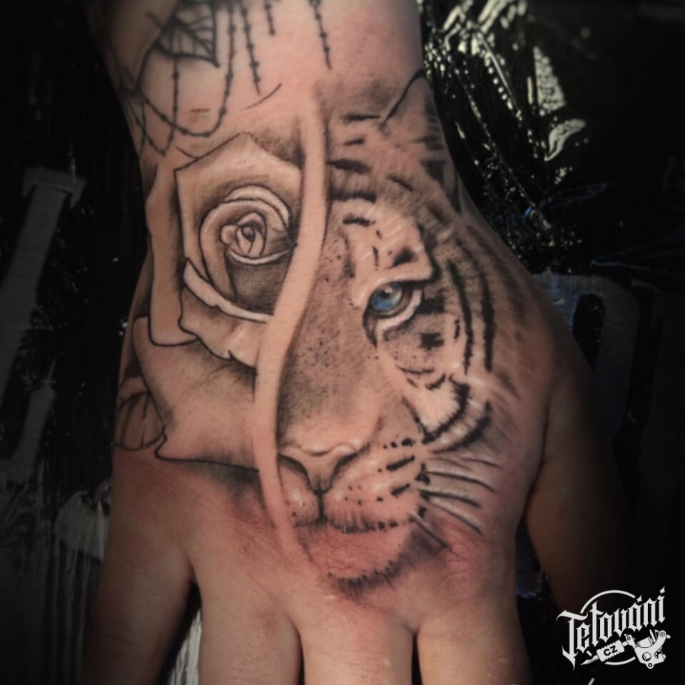 Tetování květiny, růže a zvířata, tygr na hřbetu ruky
