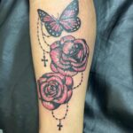 Tetování květiny růže a zvíře motýl na holeň