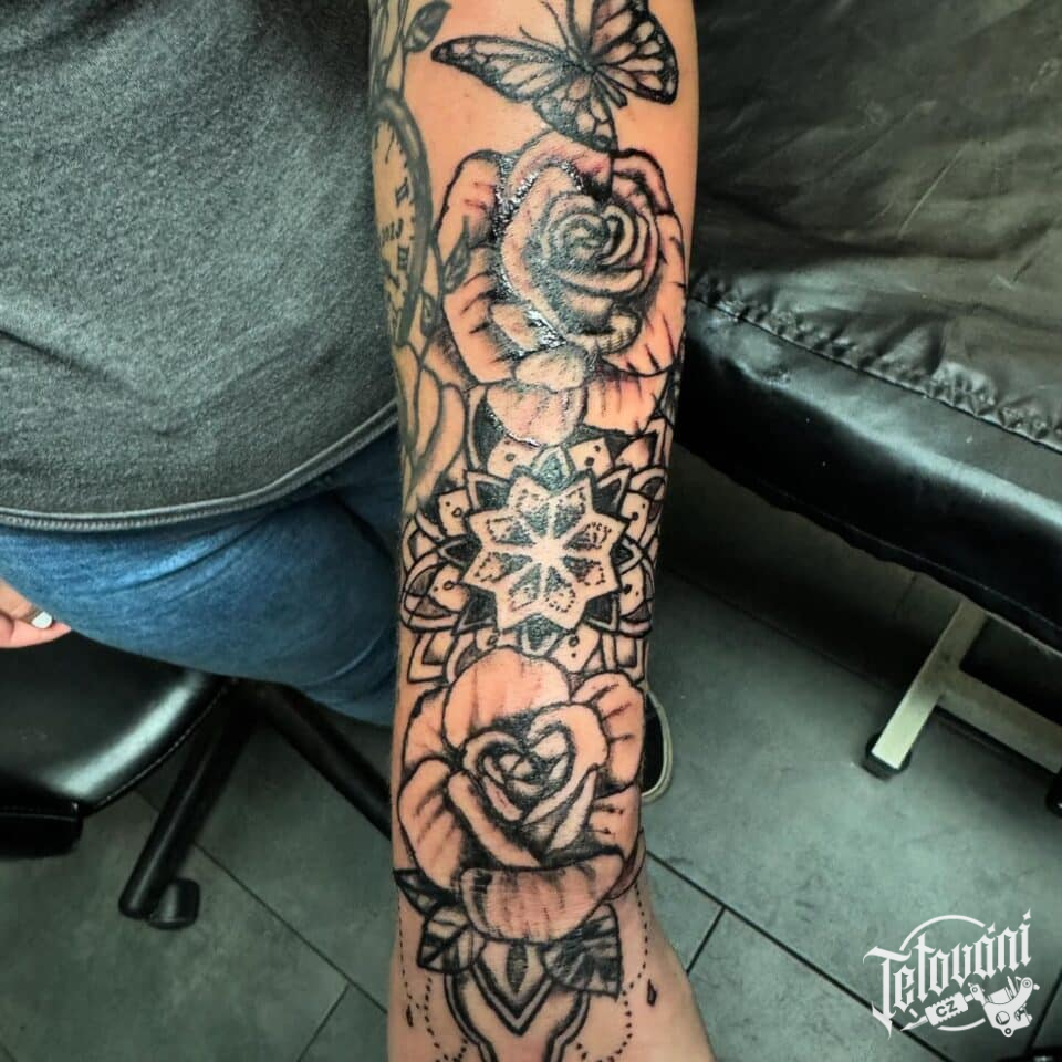 Tetování květiny růže, mandala na předloktí