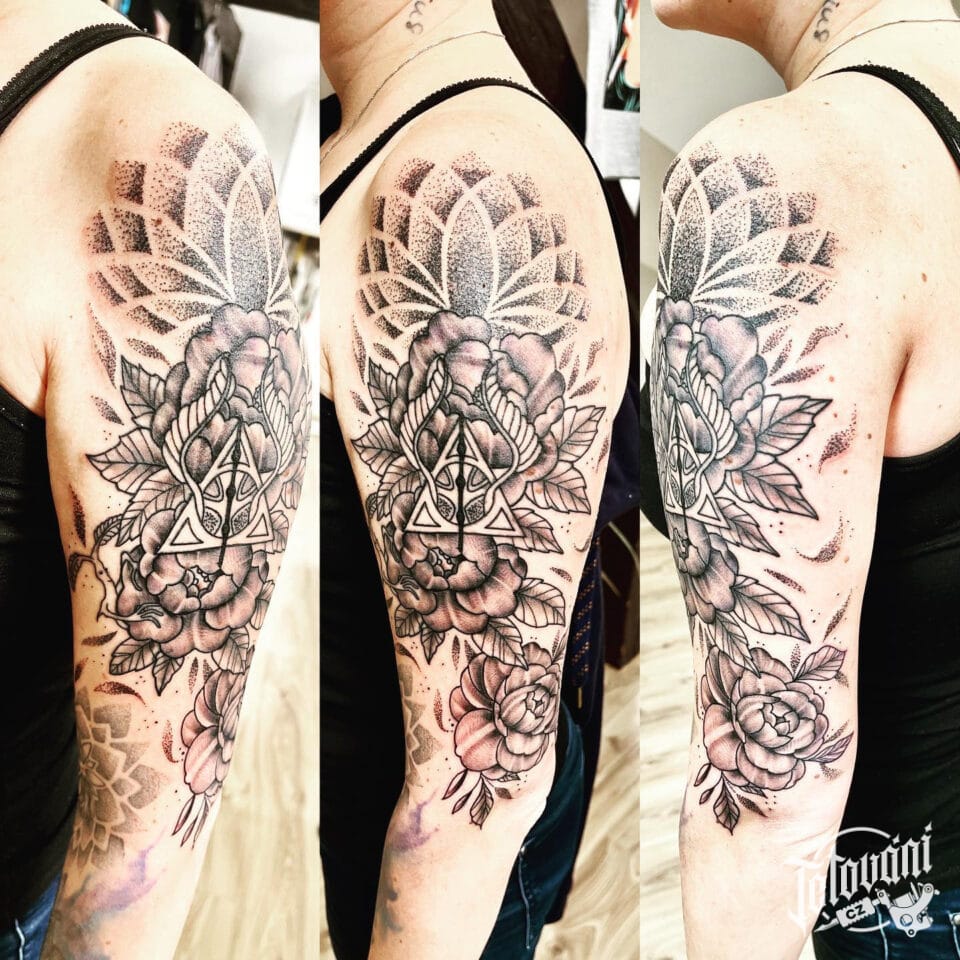 Tetování květiny růže, mandala na rameno