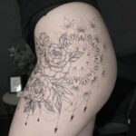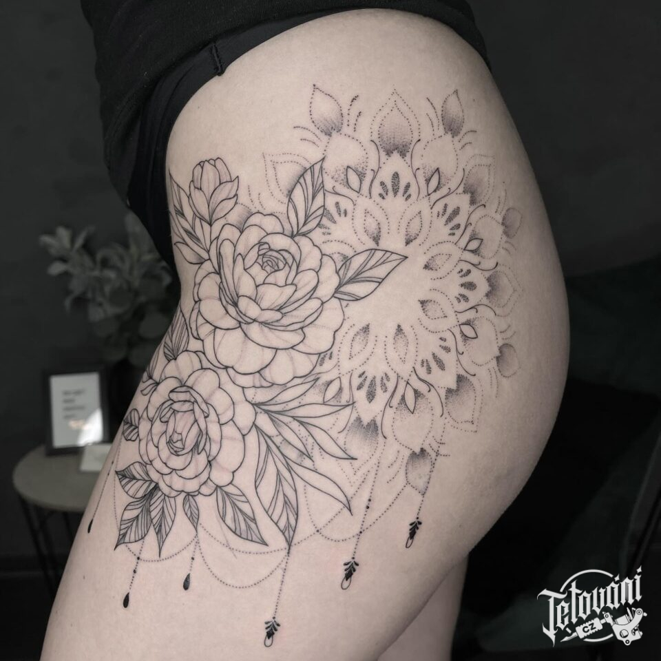 Tetování květiny, růže, mandaly na boku stehna