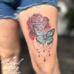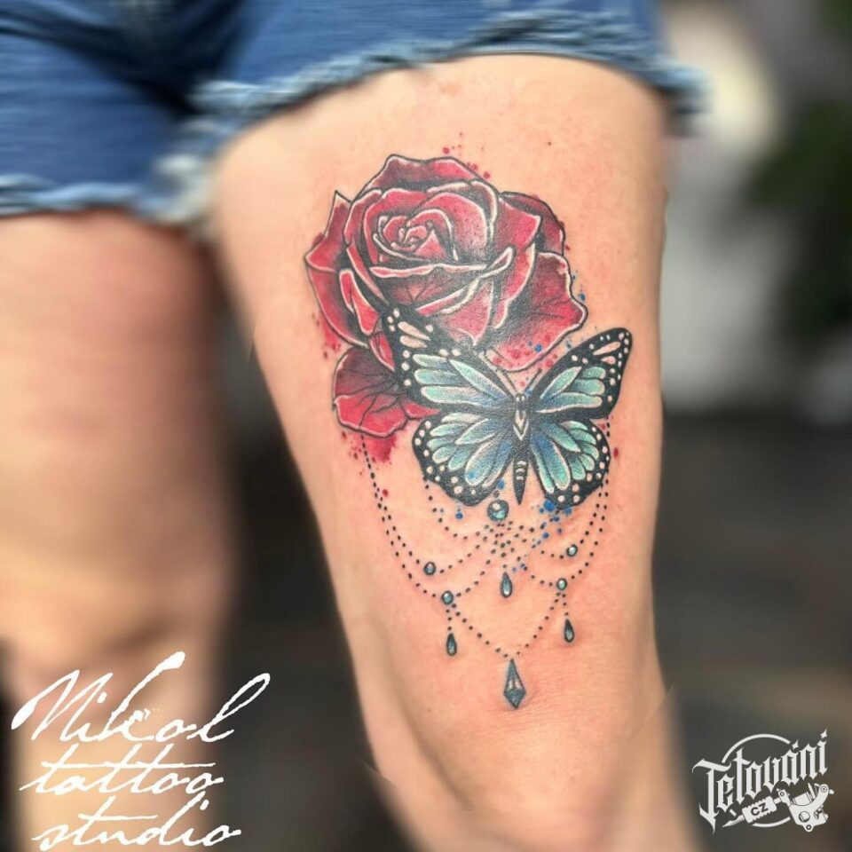 Tetování květiny, růže, motýl na stehně