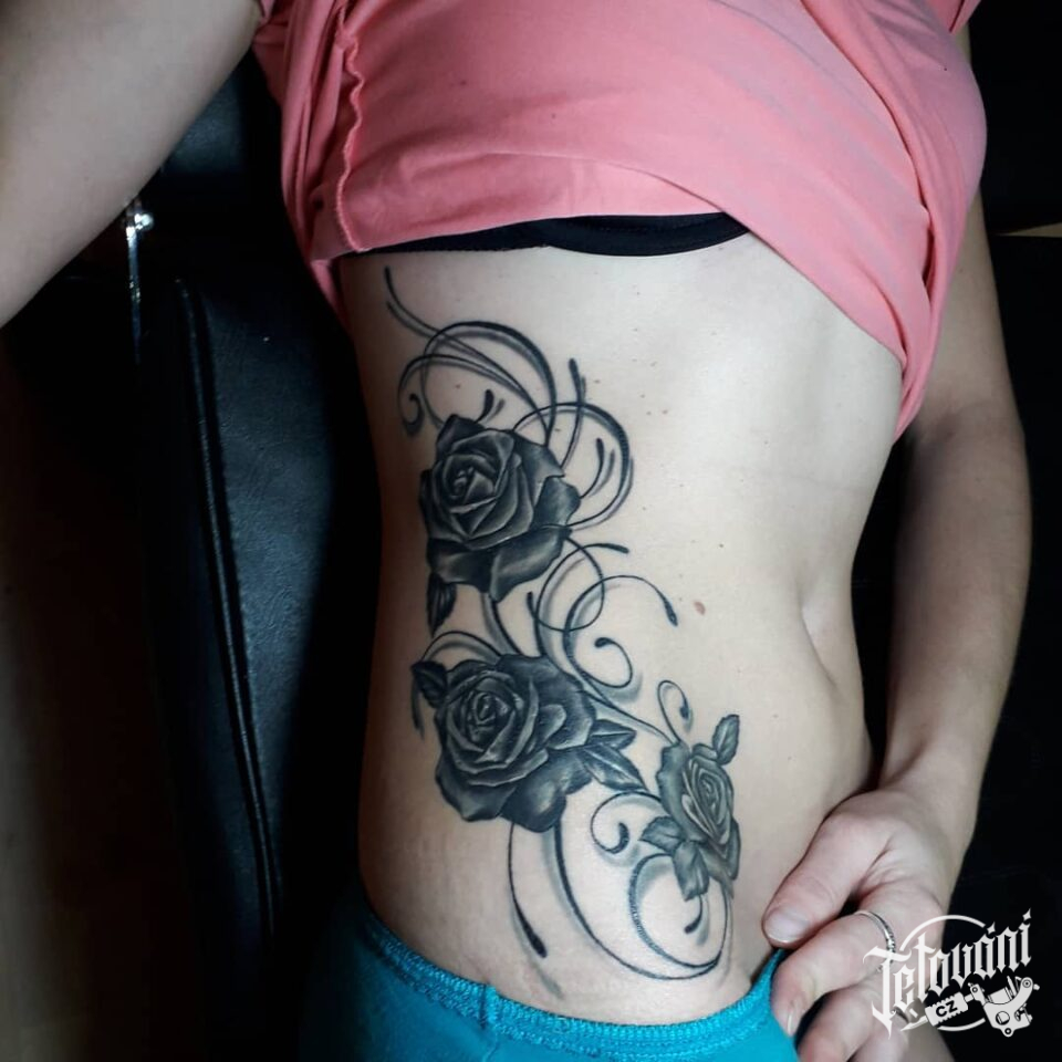 Tetování květiny, růže na boku břicha