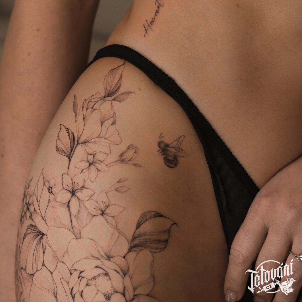 Tetování květiny, růže na boku stehna