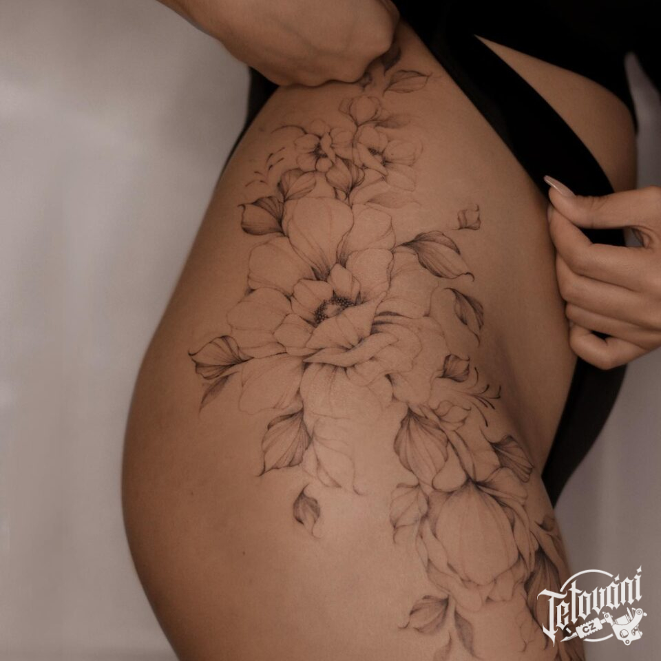 Tetování květiny, růže na boku stehna
