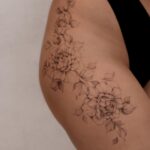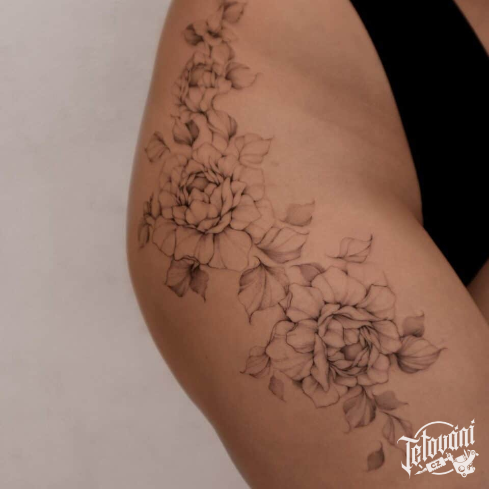 Tetování květiny, růže na boku stehna