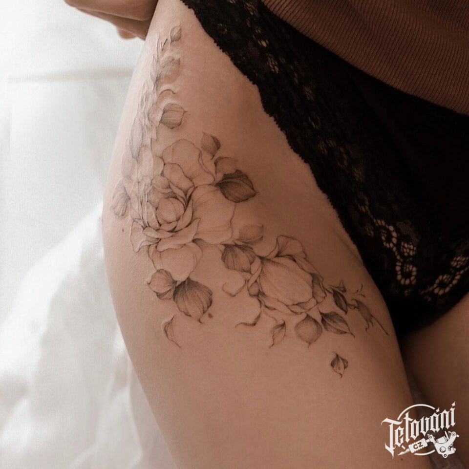Tetování květiny, růže na boku stehna