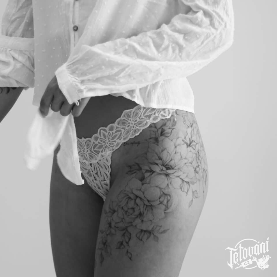 Tetování květiny, růže na boku stehna
