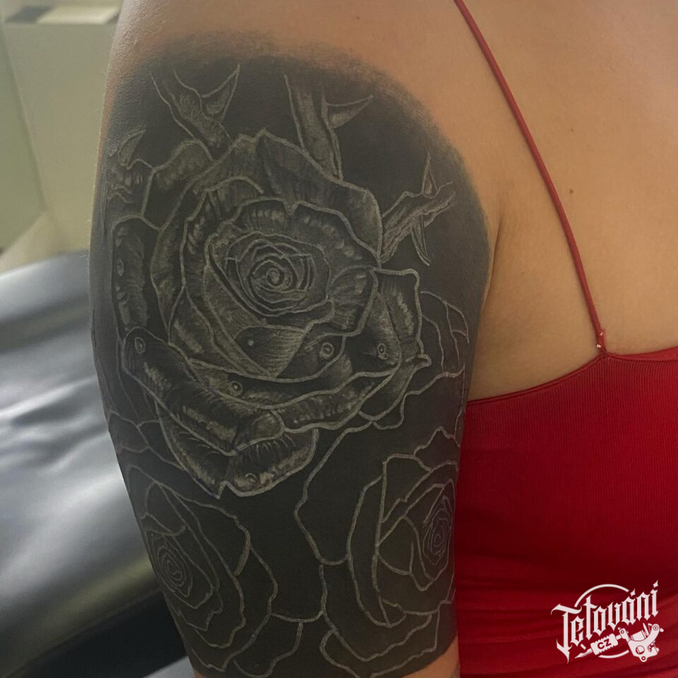 Tetování květiny, růže na rameni