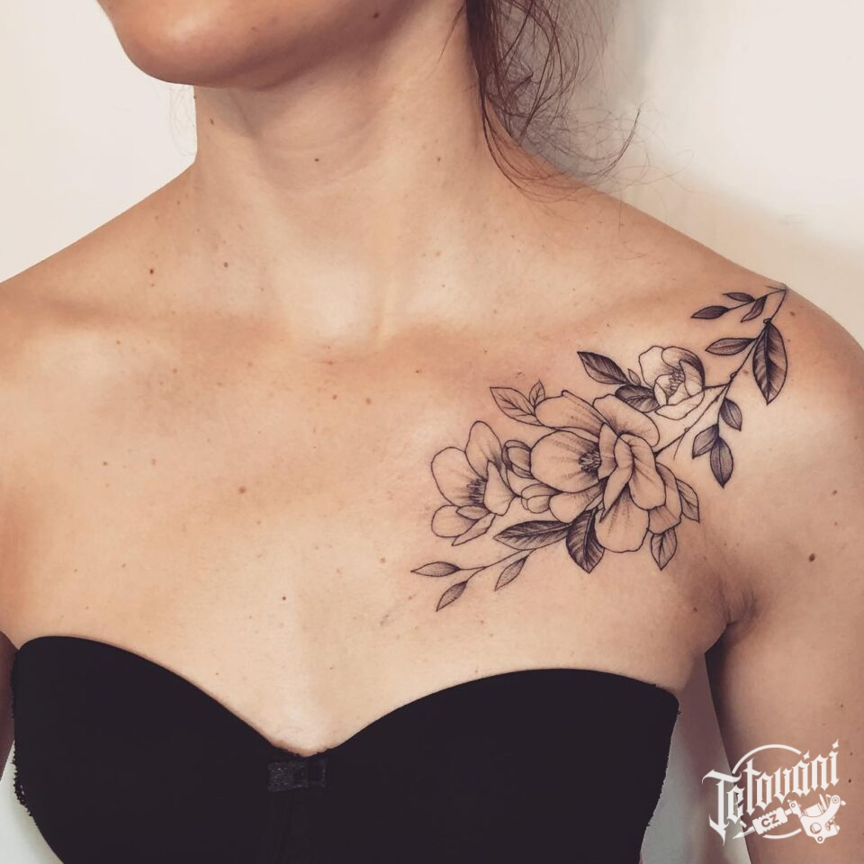 Tetování květiny růže pod klíční kost