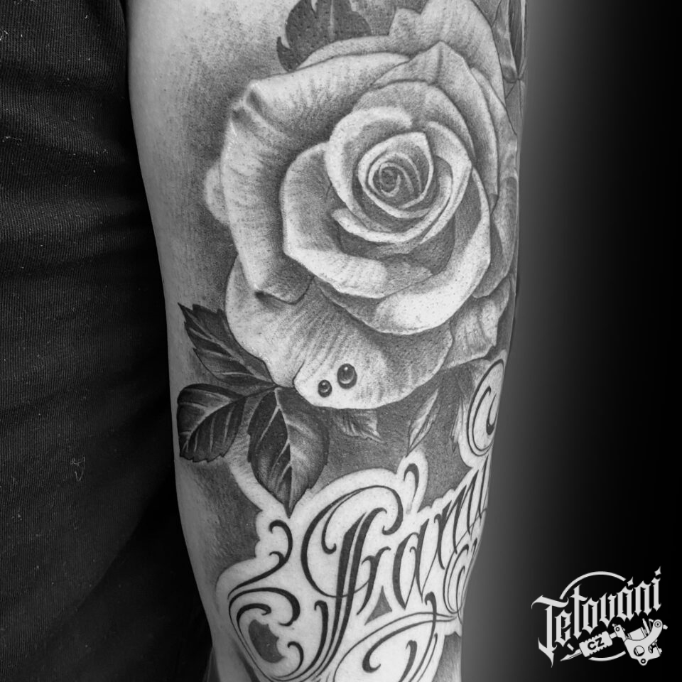 Tetování květiny, růže s nápisem na rameno