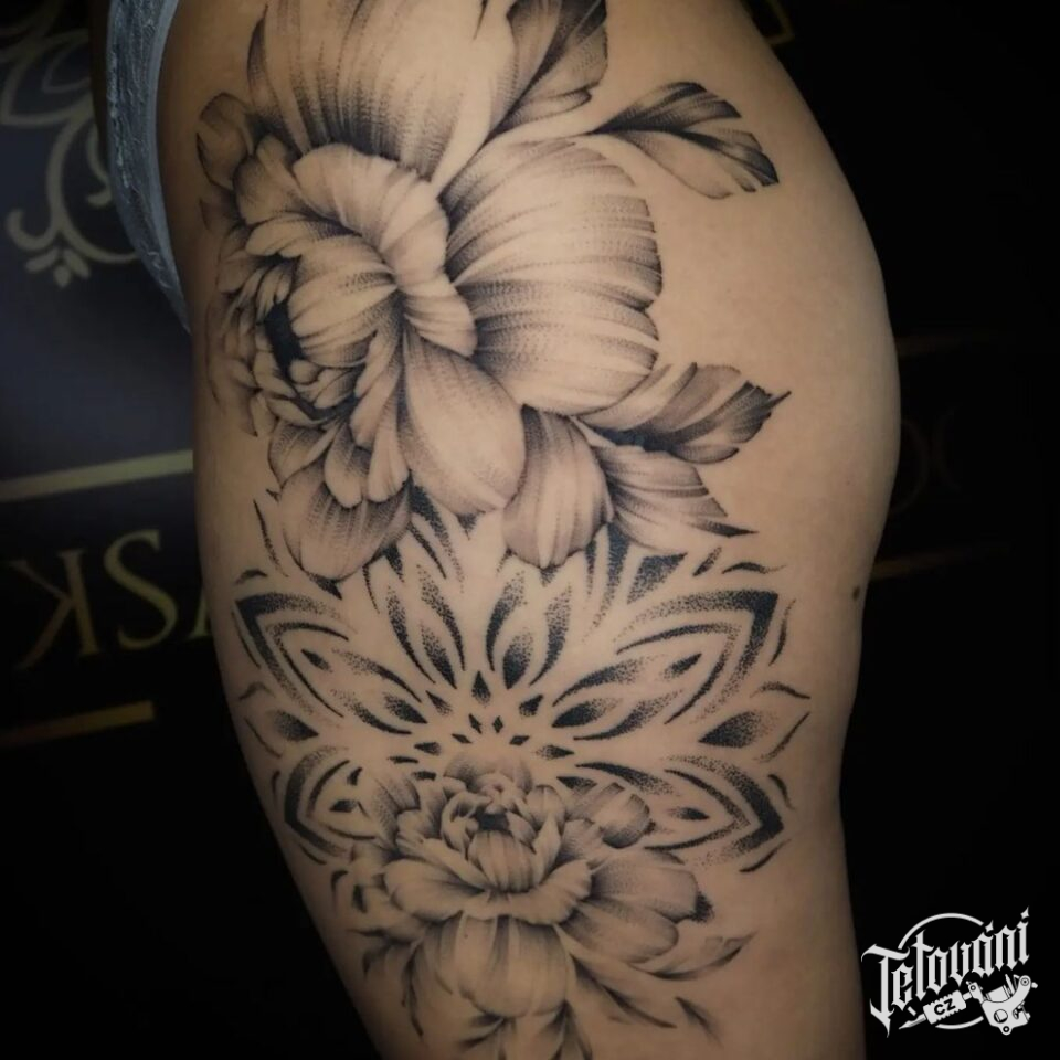 Tetování květiny s mandalou na bok stehna