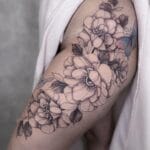 Tetování květiny s motýlem na stehno