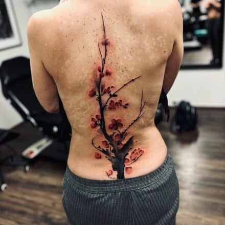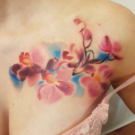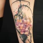 Tetování květiny, sakura a abstraktní čáry na stehně