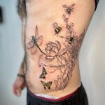 Tetování květiny se zvířaty, včely, motýli a vážky na žebrech