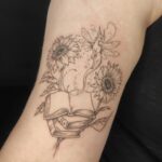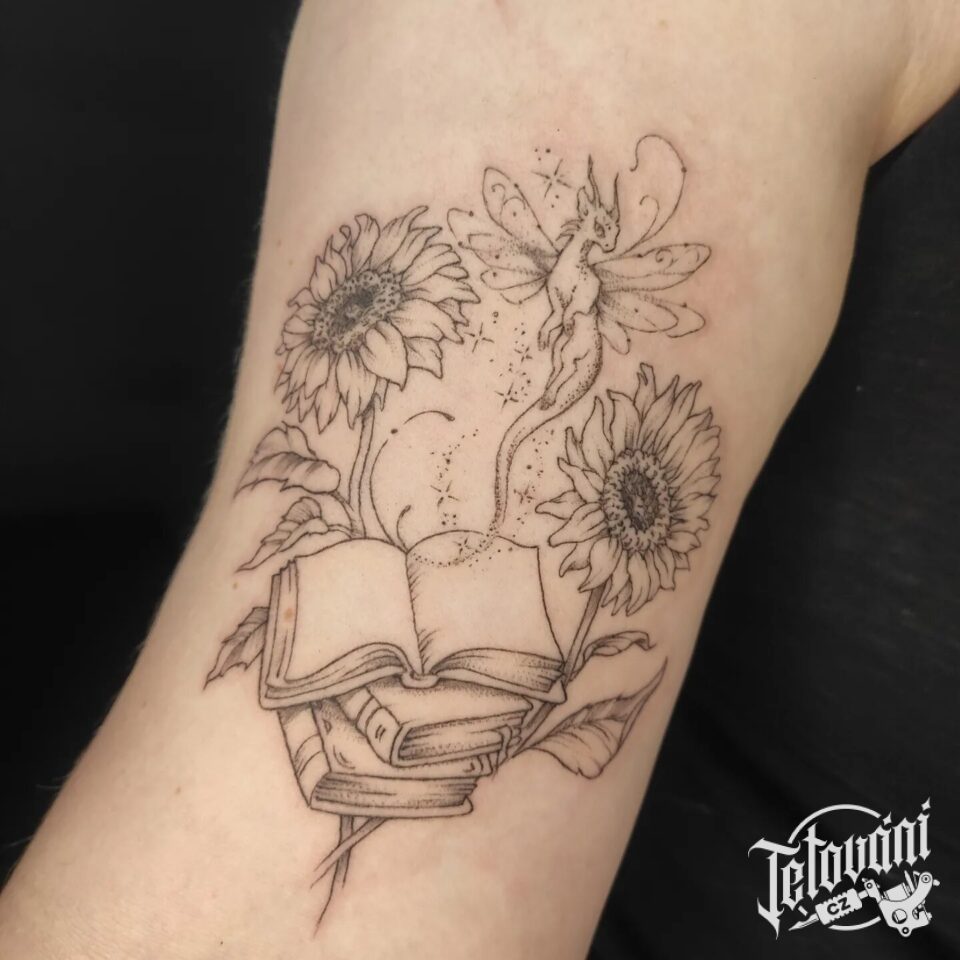Tetování květiny, slunečnice a knihy na rameno