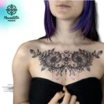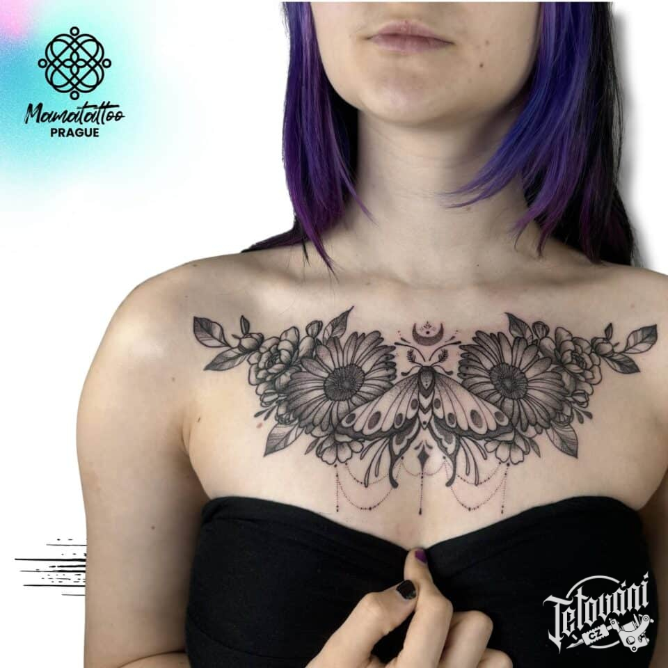 Tetování květiny, slunečnice a růže a zvířata, motýl na hrudník