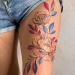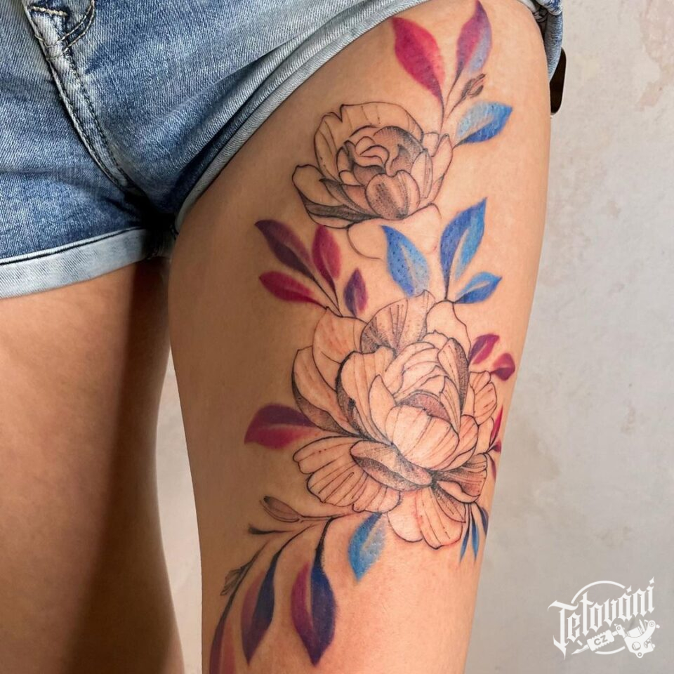 Tetování květiny, pivoňka, symboly na stehno