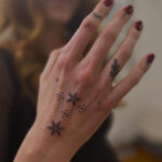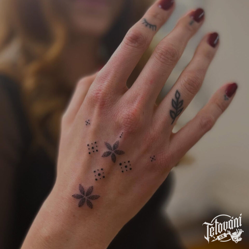 Tetování květiny, tři tečky, tečky na hřbetu ruky