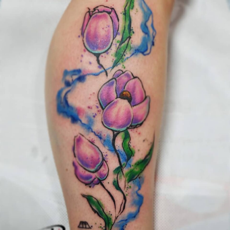 Tetování květiny, tulipány na lýtku