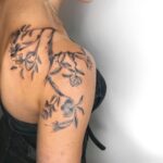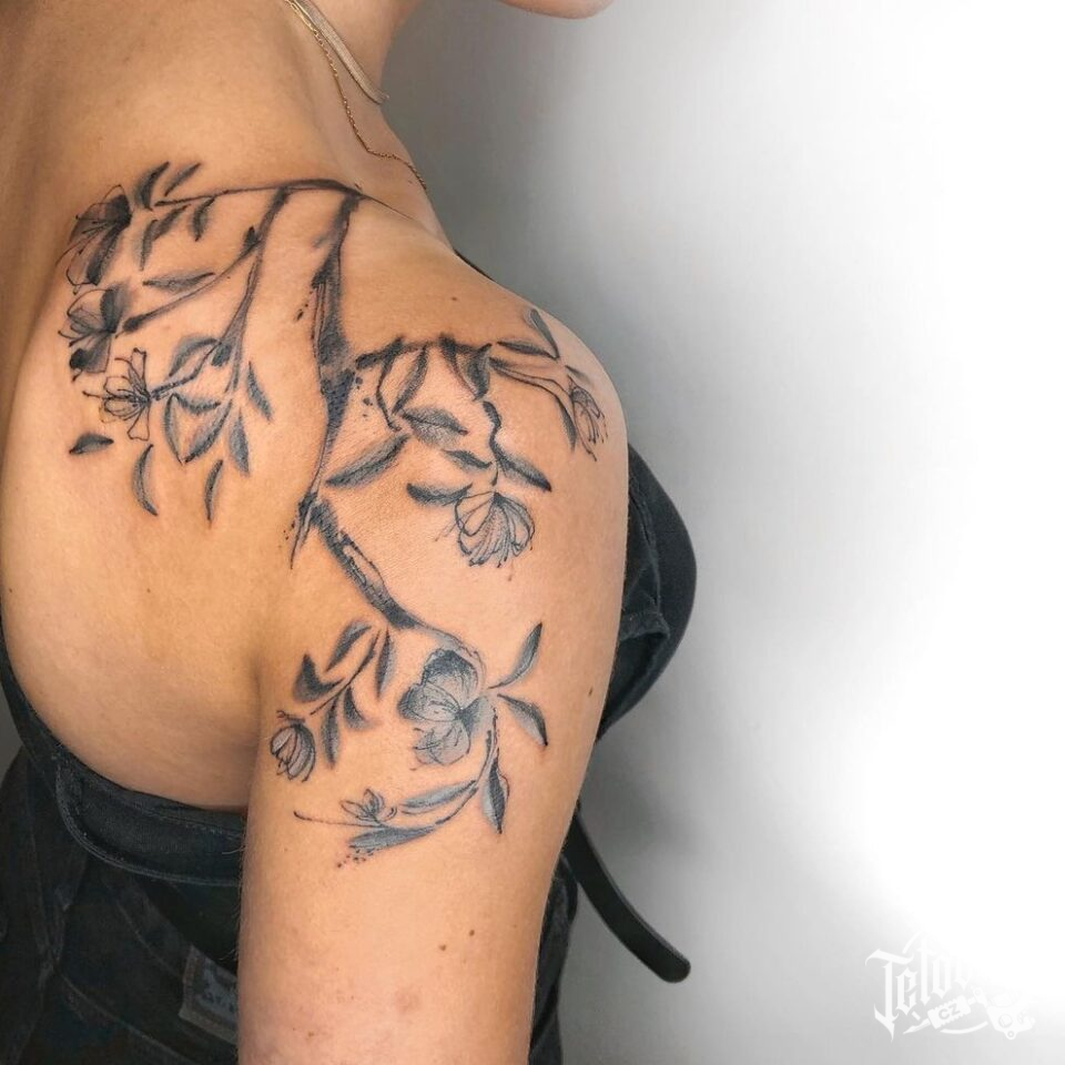 Tetování květiny, větvička, symboly na lopatku a rameno