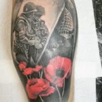 Tetování květiny, vlčí mák a vojáci na lýtku