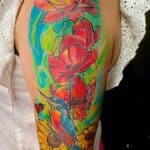 Tetování květiny, vlčí mák a slunečnice, ptáci a srdce na rameni