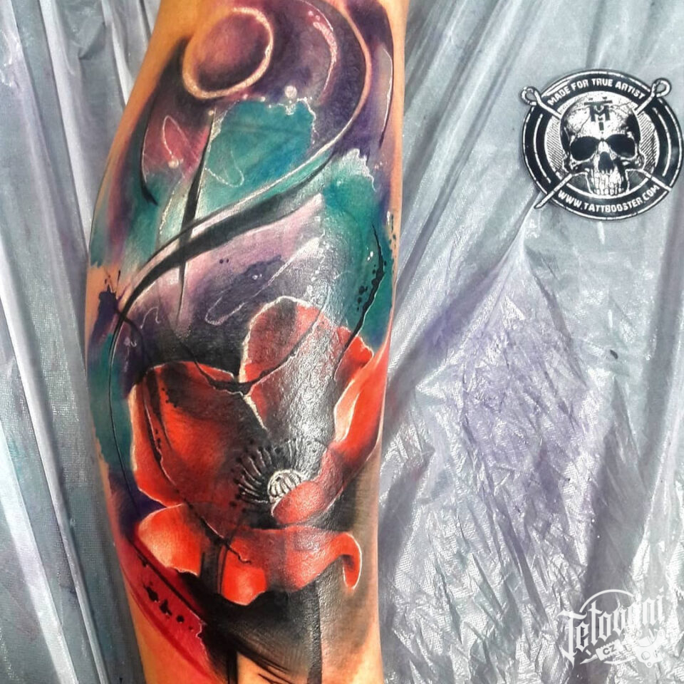Tetování květiny, vlčí mák na holeň
