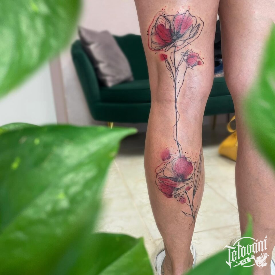 Tetování květiny, vlčí mák na noze