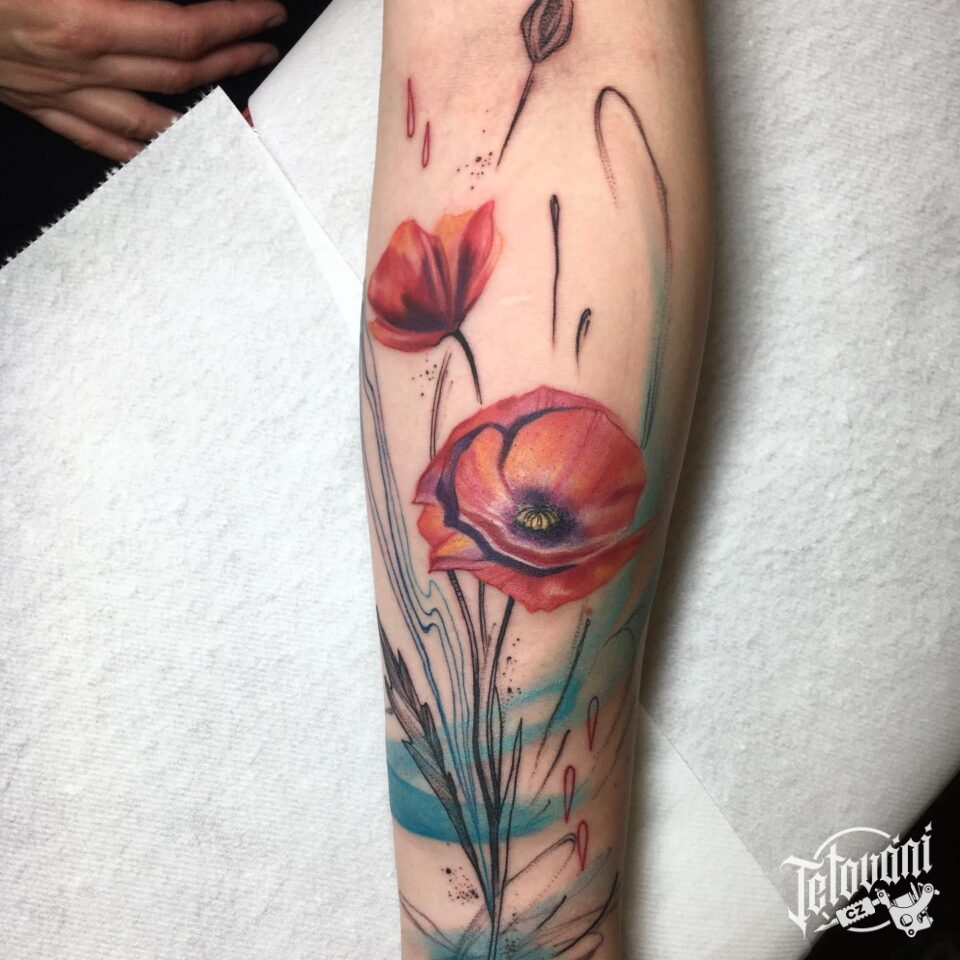 Tetování květiny, vlčí mák na předloktí