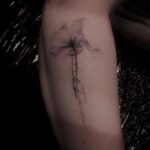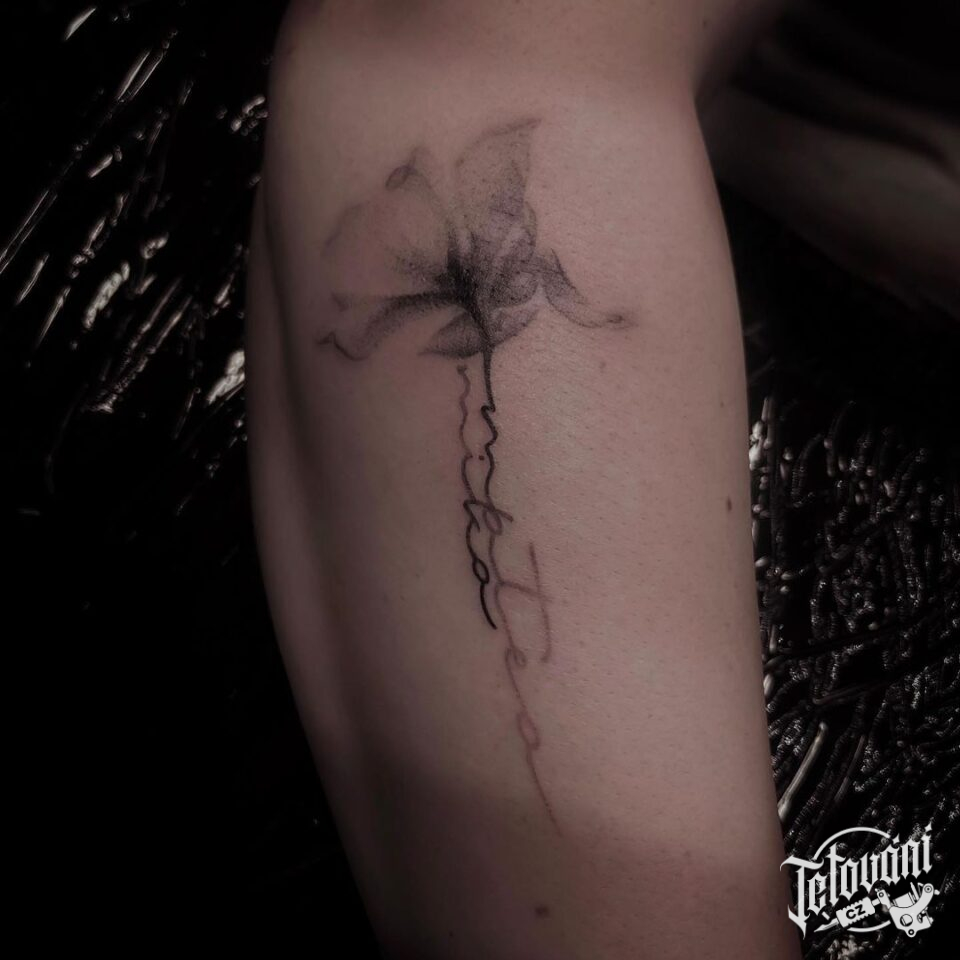 Tetování květiny, vlčí mák s nápisem na předloktí